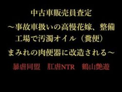 中古車販売員査定 〜事故車扱いの高慢花嫁、整備工場で汚濁オイル(糞便)まみれの肉便器に改造される〜【暴虐同盟】 事故車扱いの高慢花嫁が、整備工場で想像を絶する辱めを受ける。汚濁オイルまみれの肉便器に改造され、アナルやおっぱいを弄ばれ、中出しまでされ屈辱にまみれる。彼女のプライドは完全に崩壊し、メス堕ちしてしまう。スカトロやアナルファックなど、過激な描写が満載の作品。 同人
